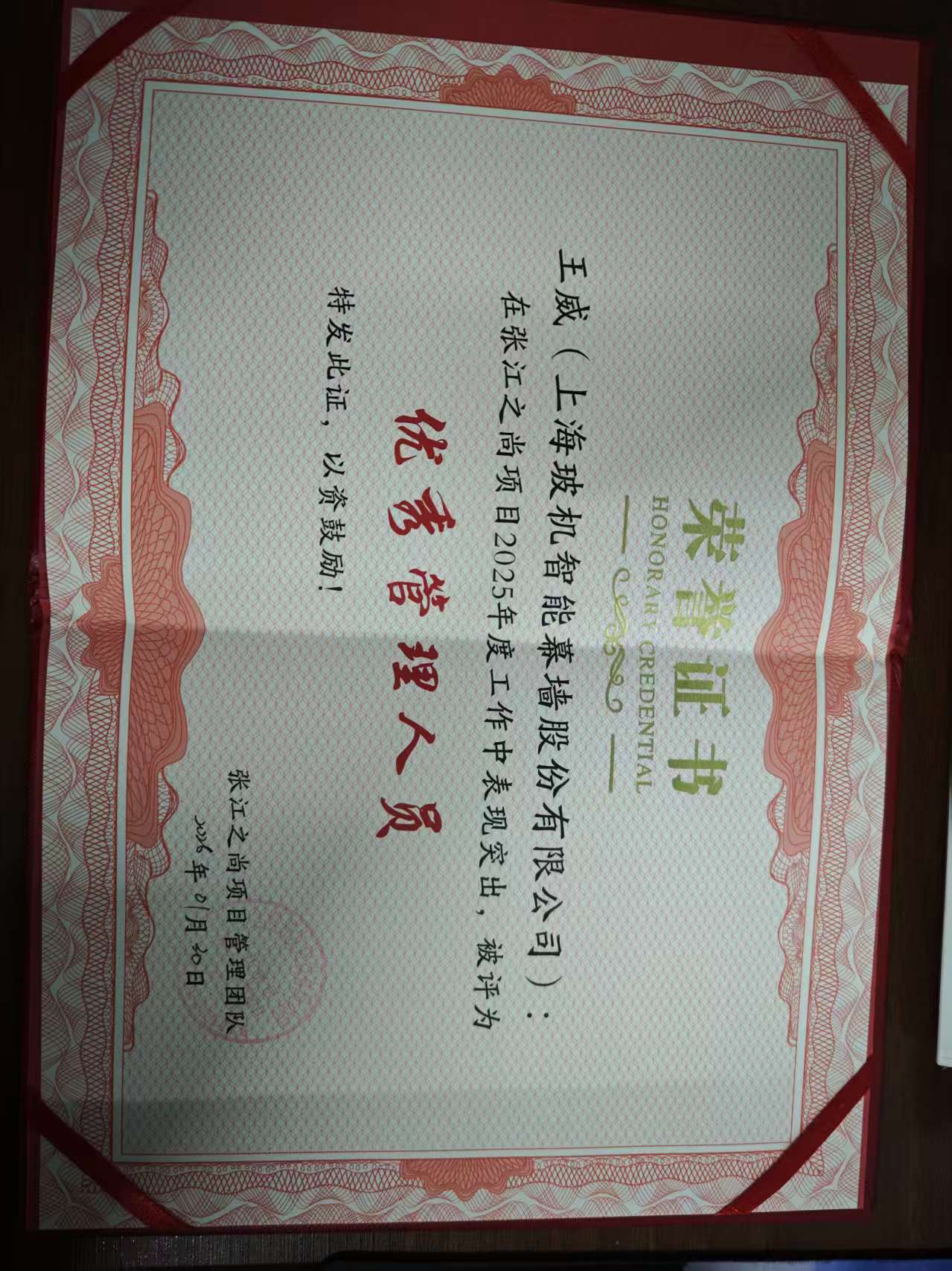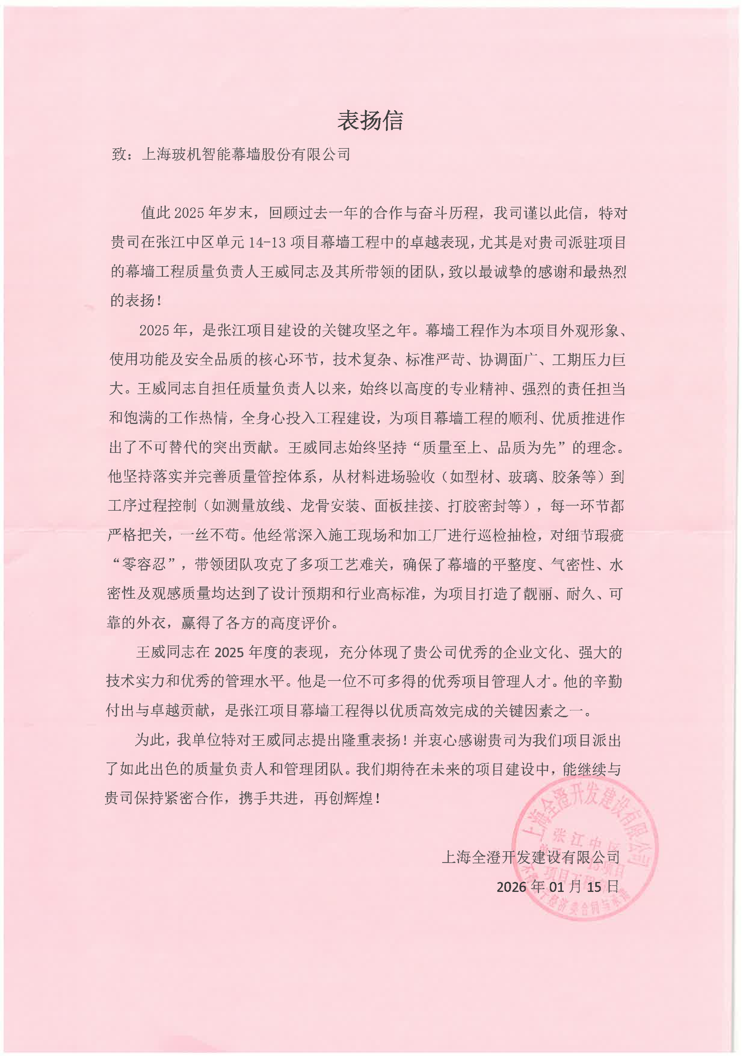 近日,公司收到来自业主的一封表扬信,信中对张江中区单元14-13项目幕墙工程质量负责人王威及其团队表达诚挚感谢和热烈表扬。业主对王威在项目管理过程中展现的专业精神、责任担当和卓越贡献给予了高度评价。同时,王威还被授予张江之尚项目2025年度“优秀管理人员”称号。这背后,是他与团队的辛勤付出与专业坚守。